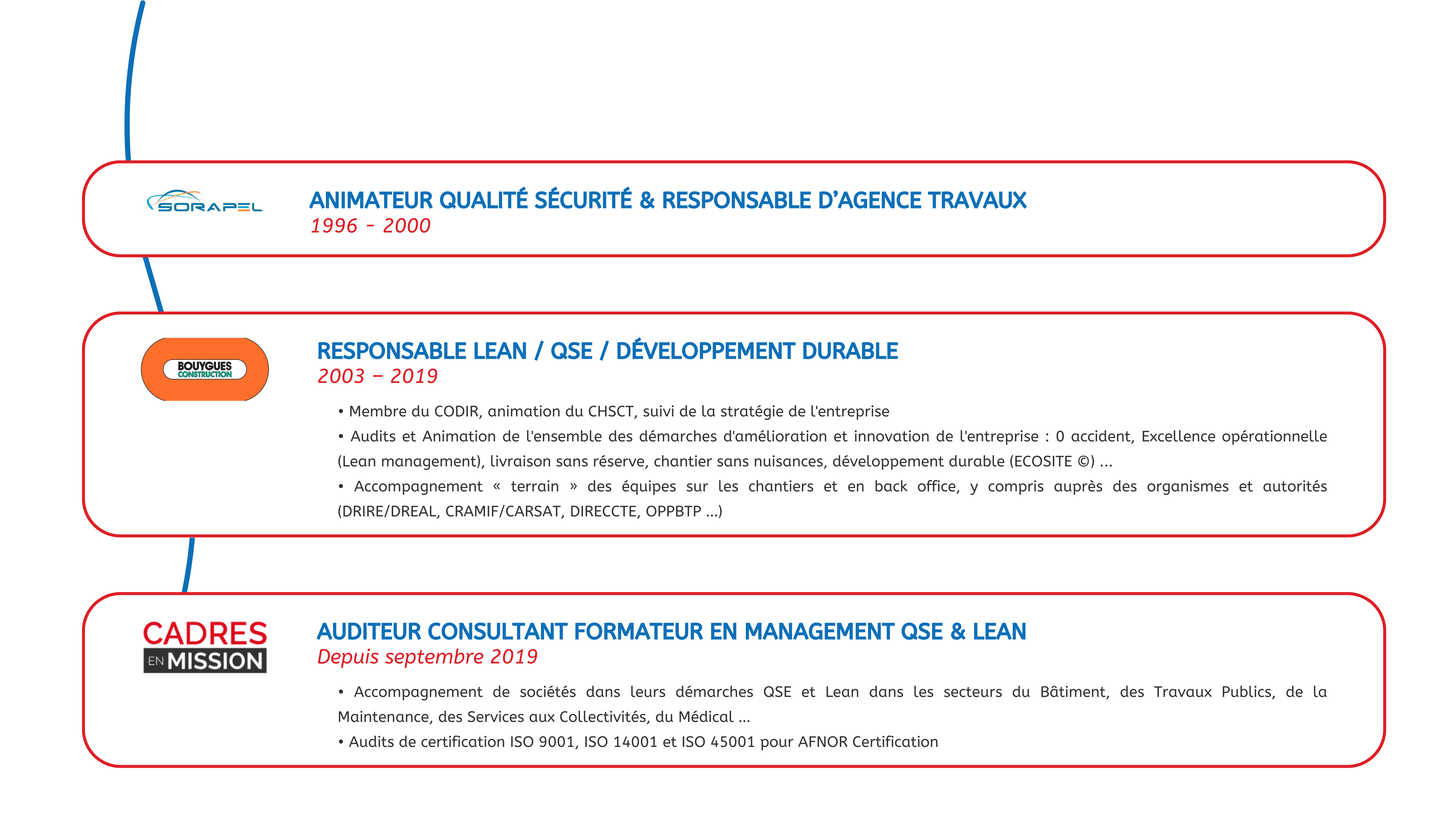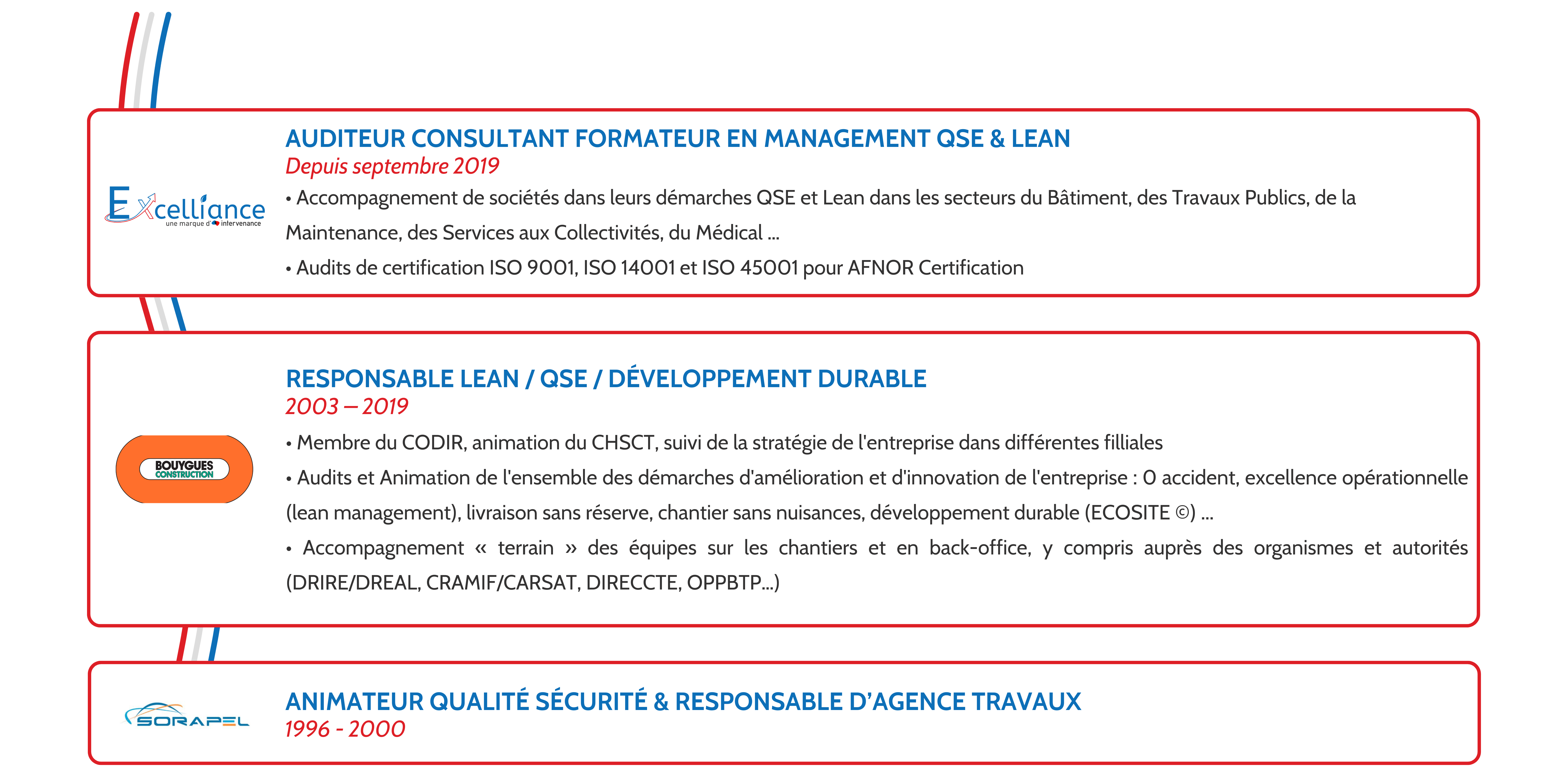 Fort d’une expérience professionnelle riche dans les domaines du management de structures allant d’une dizaine de collaborateurs à plusieurs centaines, sanctionnée par plusieurs certificats / qualifications professionnelles reconnues, je veux vous faire bénéficier de mes compétences et de mon expertise dans les domaines de la formation, du management de la Qualité, de la protection de la Santé et la Sécurité et de l’Environnement, de l’Excellence opérationnelle et des démarches de Résilience des organisations.